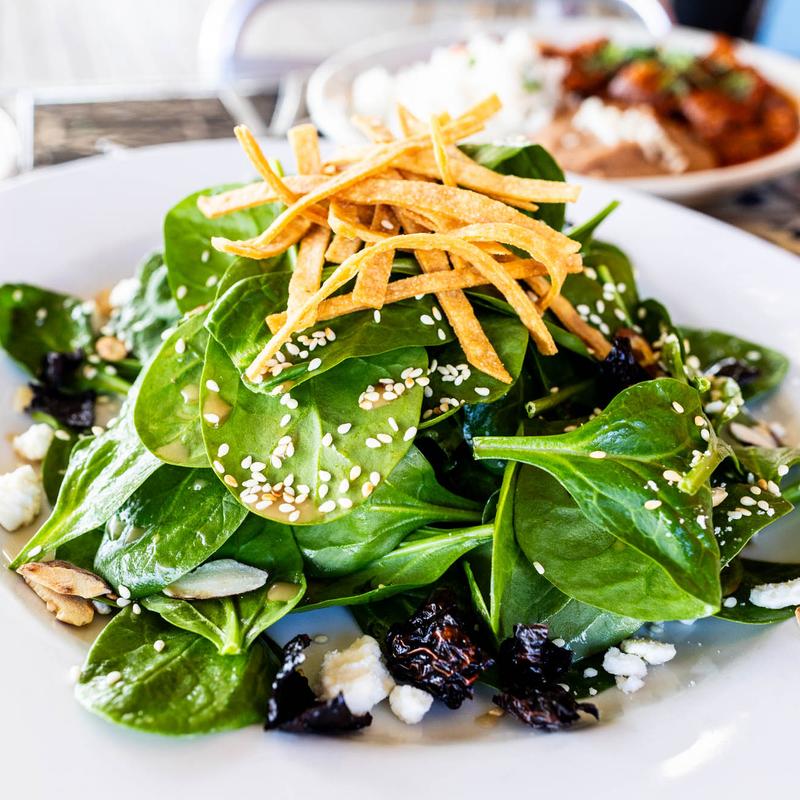Spinach leaves tossed in a citrus vinaigrette and topped with toasted almonds, ancho peppers, goat cheese, sesame seeds, and fried tortilla strips | With Grilled Chicken +$4.00