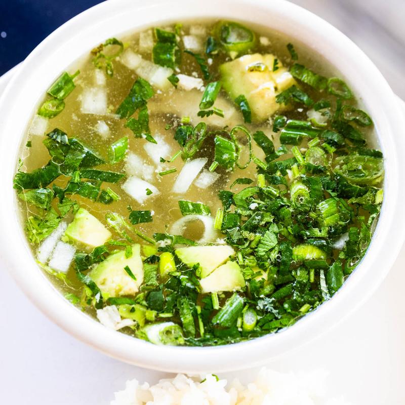 Cup $5.79 | Bowl $8.79 • A Oaxaca classic. Boneless chicken pieces in a clear, flavorful broth topped with cilantro, green onion, and avocado. Rice, jalapeños, and lime wedges accompany this simple soup to be flavored to your liking.